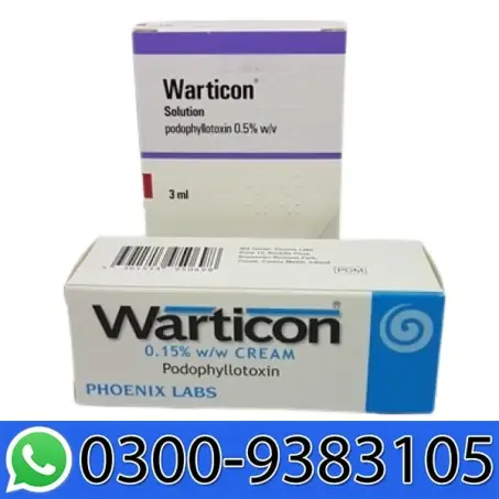 Warticon cream is a prescription-required therapy for external genital warts that is offered in Pakistan with nationwide delivery, including Lahore and Karachi, for 1100. It contains podophyllotoxin, a natural antiviral that targets the underlying cause of HPV rather than just the warts it causes. Warticon stops the virus from proliferating, which kills the wart cells and makes room for healthy skin to grow in their place. When taken properly, Warticon can eradicate genital warts entirely in four weeks. Warticon is used twice a day for three consecutive days, after which it is not applied for four days. You can perform this up to four times. Warticon is available in two formulations: a blue solution with a 0.5% concentration and a white cream with a 0.15% concentration. Applicators are part of the solution to enable a more precise application.